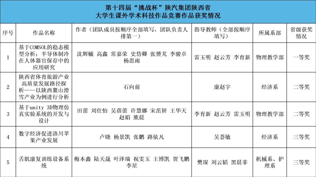 本届竞赛自启动以来,全省共有80所高校报名参赛,经过校内选拔,878件作品推报至省赛组委会,参赛学校和作品数量均创新高。经过资格审核、网评等环节,共有68所高校的321件作品入围终审决赛。我院申报的作品中,《基于COMSOL的稳态模型分析:半导体制冷在人体器官保存中的应用研究》荣获省赛一等奖,《基于unity3D物理仿真实验系统的开发与设计》《陕西省体育旅游产业高质量发展路径探析——以陕西鳌山滑雪产业为例进行分析》荣获省赛二等奖,《舌肌康复训练设备系统》《数字经济促进洛川苹果产业发展》荣获省赛三等奖。