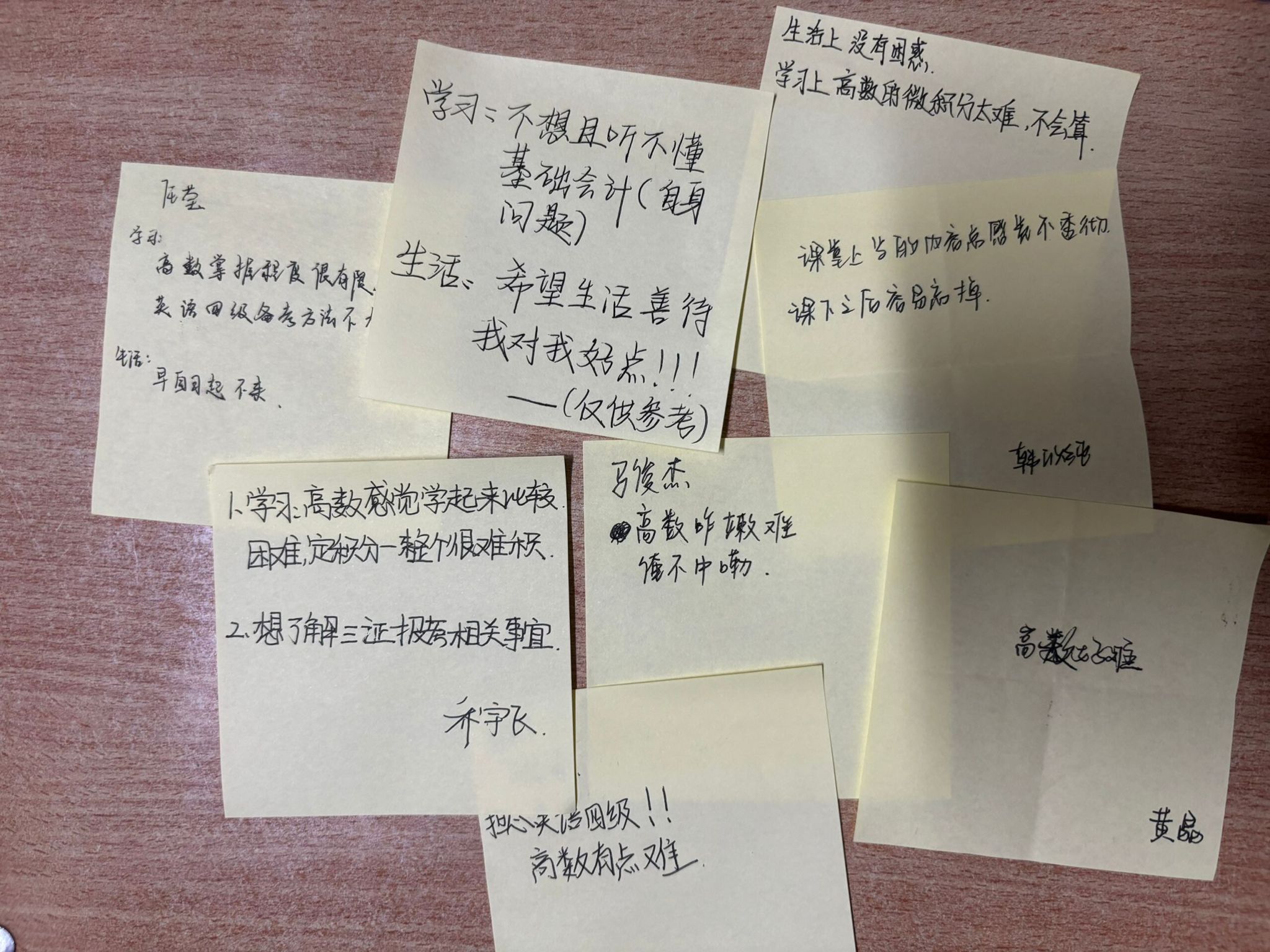 学院面向会计、工商管理、人力资源管理专业大一学生开展“困惑小纸条”匿名征集活动,鼓励学生写下在高数、线性代数等学业中的疑难问题。各班学委统一收集后,由辅导员和班导生分类整理,共收到困惑反馈200余条,内容涵盖知识点理解、学习方法、时间管理等。学院根据问题类型,针对性安排班导生答疑、教师专题辅导。活动有效打通了学生诉求反馈渠道,为后续帮扶提供了精准方向。