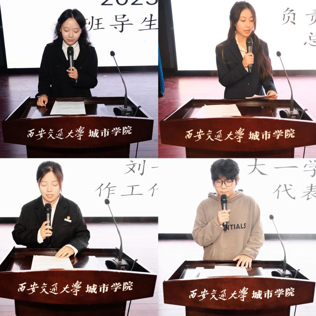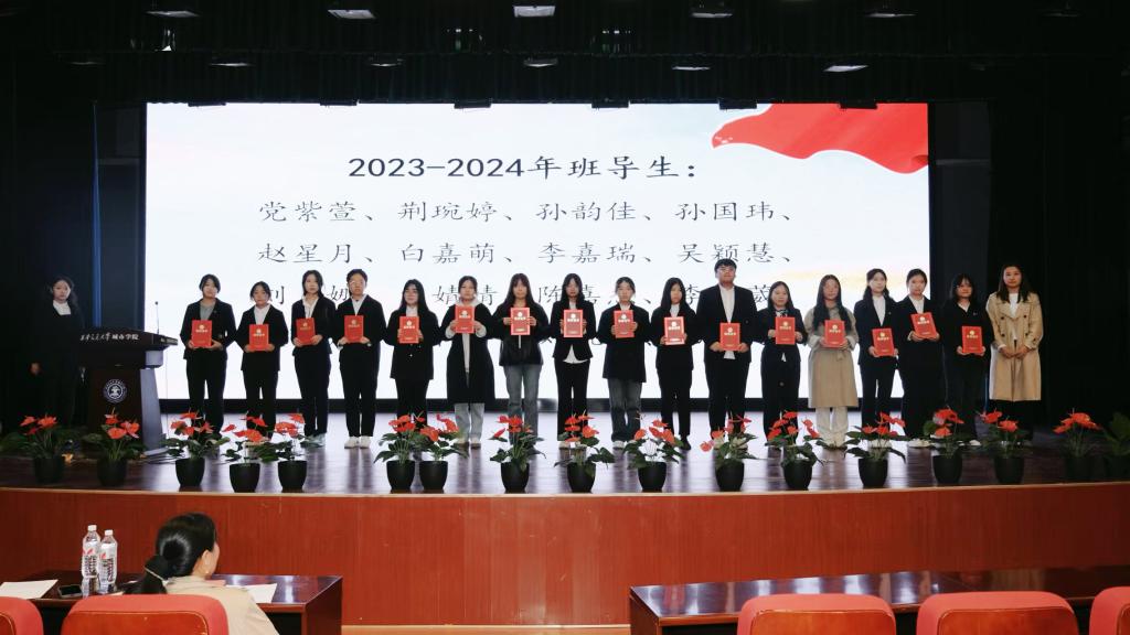 李璐为2023-2024学年班导生颁发聘书。李泽葳代表上一届班导生作总结发言,她从学习帮扶、宿舍生活、校园活动组织等方面分享了自己的工作经验,指出班导生工作虽然琐碎但意义重大,能够切实帮助低年级学生明晰学习目标,营造良好的学习氛围。刘子怡代表新一届班导生作工作展望,表示将秉承上一届班导生的优良作风,充分发挥班导生作用。李为震作为大一学生干部代表发言,提出了大一学生目前存在的问题和疑惑,并表示将全力配合班导生,共同助力学风建设。