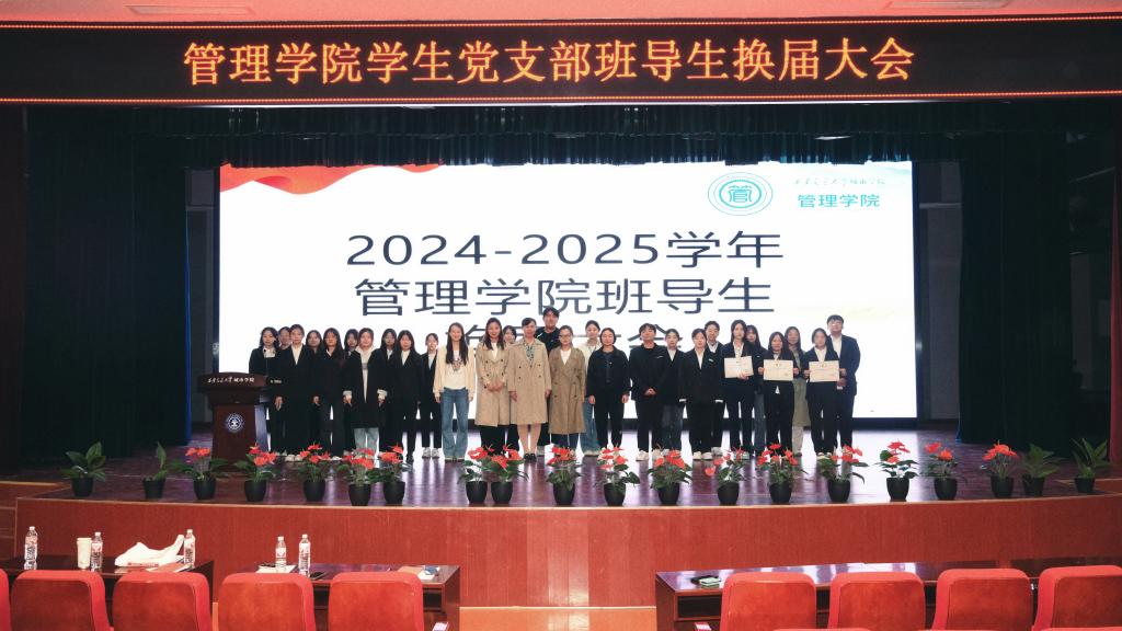 为进一步加强学风建设,发挥优秀学生榜样引领作用,管理学院于10月23日在教二报告厅召开了2024-2025学年班导生换届大会,管理学院学生党支部书记刘健、李璐,组织委员康轲岚、刘连宏,宣传委员张天源、柯智航,2022级辅导员拓桦真、2024级辅导员史青及部分学生代表参加会议,会议由田果主持。