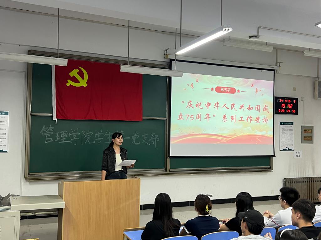为庆祝中华人民共和国成立75周年,管理学院学生第一党支部于9月25日晚在教2-107举行“盛世中华,同心同行”主题党日活动。党支部书记刘健、支部组织委员康轲岚、辅导员张天源以及全体党员参加,活动由刘健主持。