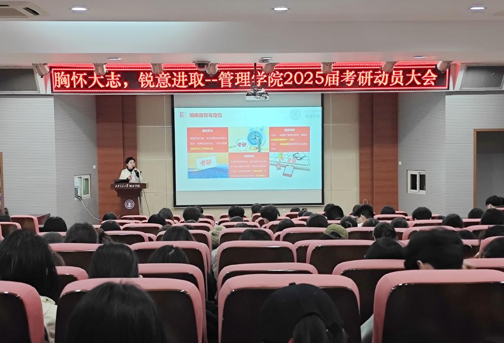 为充分了解2025届学生的考研需求,激发学生考研的信心和动力。4月2日晚,管理学院在F100举办“胸怀大志,锐意进取”2025届考研动员大会。院长助理王旭、刘健,团工委书记柯智航参加会议。大会由王旭做动员讲座,柯智航主持会议。