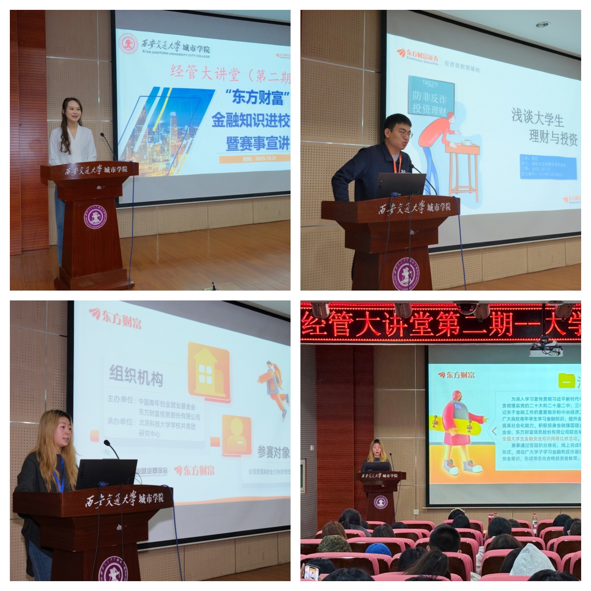 为提升大学生金融素养,帮助其树立科学理财及金融安全观念,10月21日,经济与管理学院在F100举办“经管大讲堂”第二讲——大学生理财与投资。经济与管理学院副院长王旭、院长助理刘健,金融系主任刘萍、东方财富高校西北区负责人席倩倩、东方财富证券咸阳人民西路证券营业部资深讲师曹任以及金融专业的老师和辅导员们出席活动。会议由史青主持。