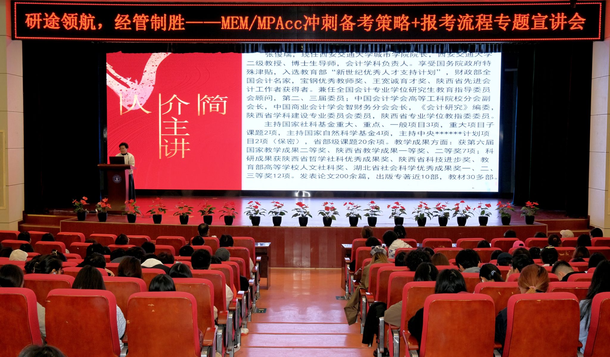 为帮助经管学院学子对备考规划与未来报考有清晰的认知,聚焦学子考研需求。10月22日晚,经济与管理学院在教二报告厅举办“研途领航,经管制胜--西安交通大学MEM/MPAcc”专题宣讲会。西安交通大学二级教授、博士生导师、国务院政府特殊津贴获得者、财政部全国会计名家、经济与管理学院院长张俊瑞教授担任主讲人,副院长王旭,院长助理刘健,辅导员柯智航、刘连宏、康轲岚及三百余名同学参与宣讲会。会议由副院长王旭主持。