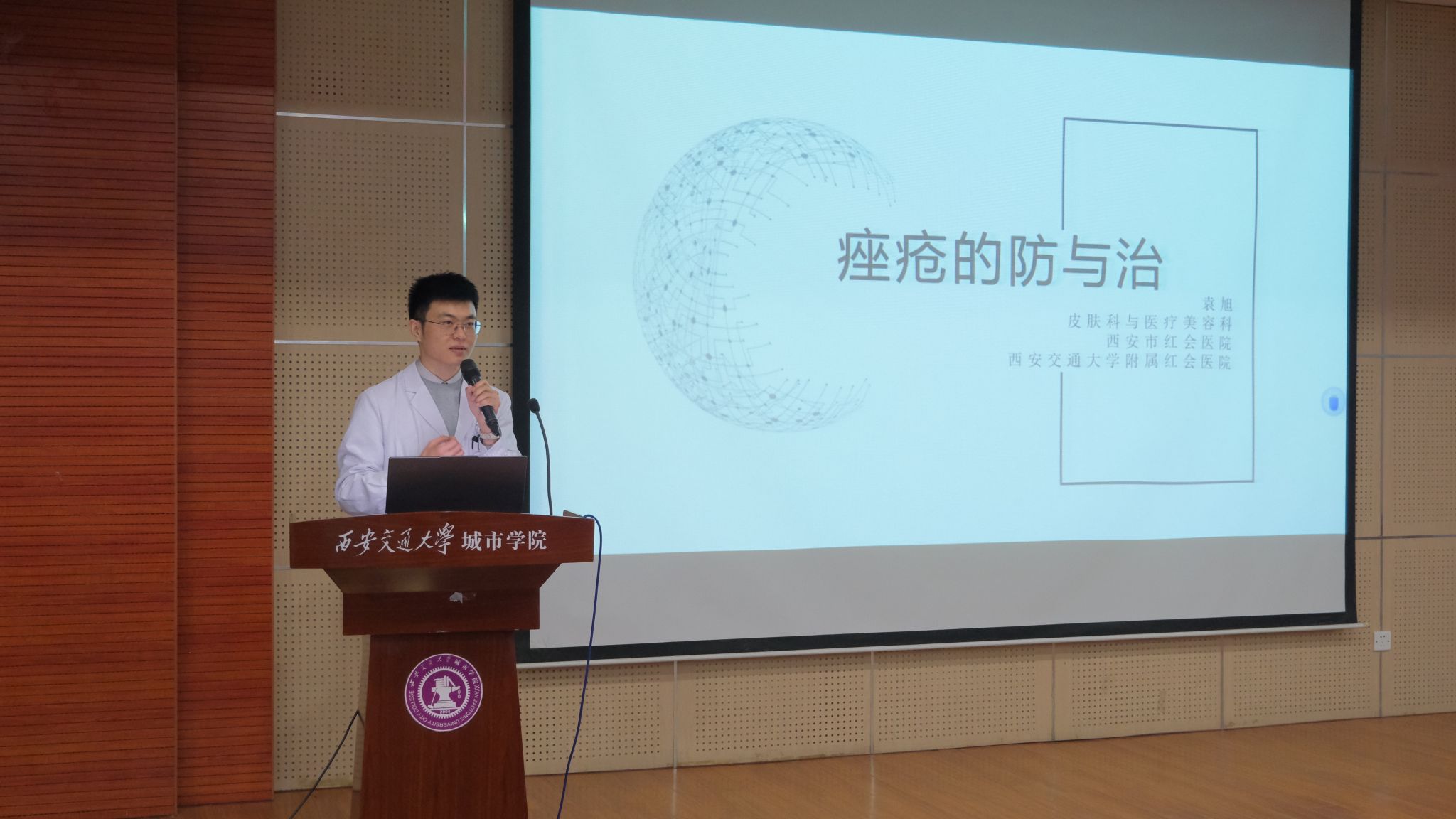 袁旭以“痤疮的防与治”为主题,结合大学生群体生理特点与常见皮肤问题,用通俗易懂的语言讲解了痤疮的成因、分型及日常护理要点。从饮食调理、作息管理到科学护肤、规范用药。他针对学生关心的“如何安全祛痘”“避免痘印痘疤”等问题进行细致解答,并提醒同学们远离不科学的祛痘偏方,树立理性护肤观念。