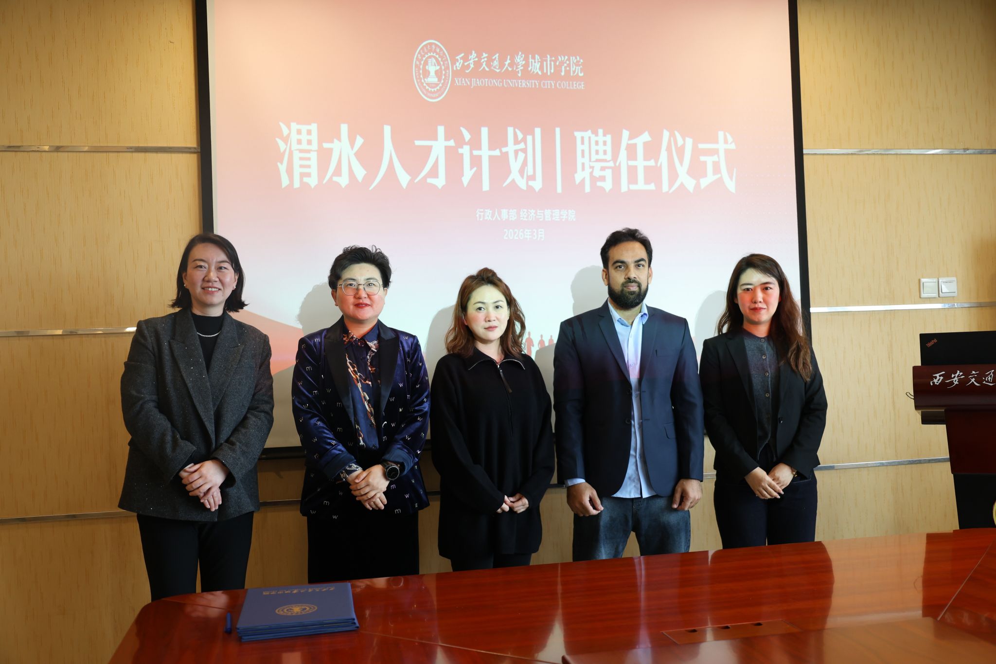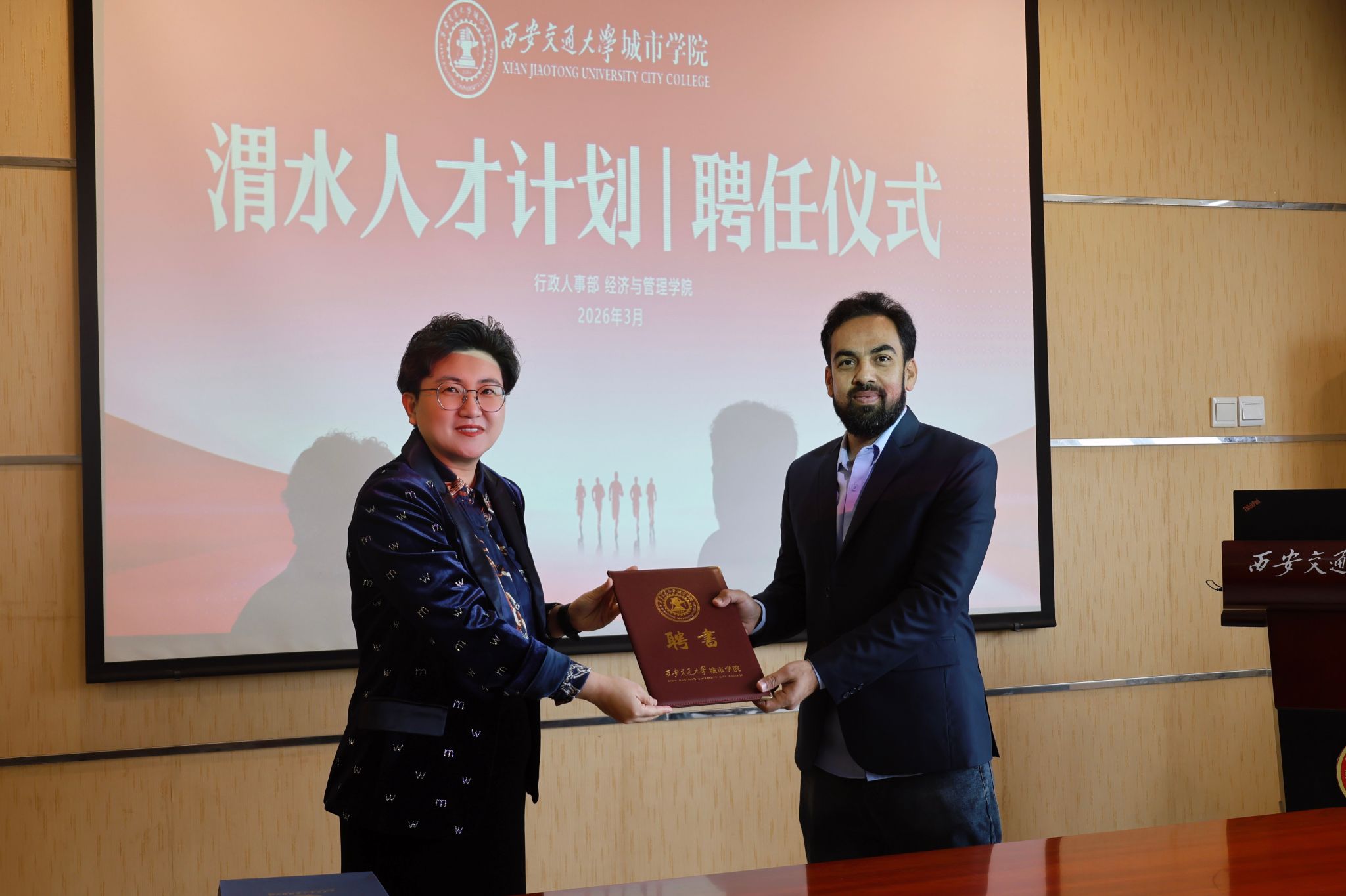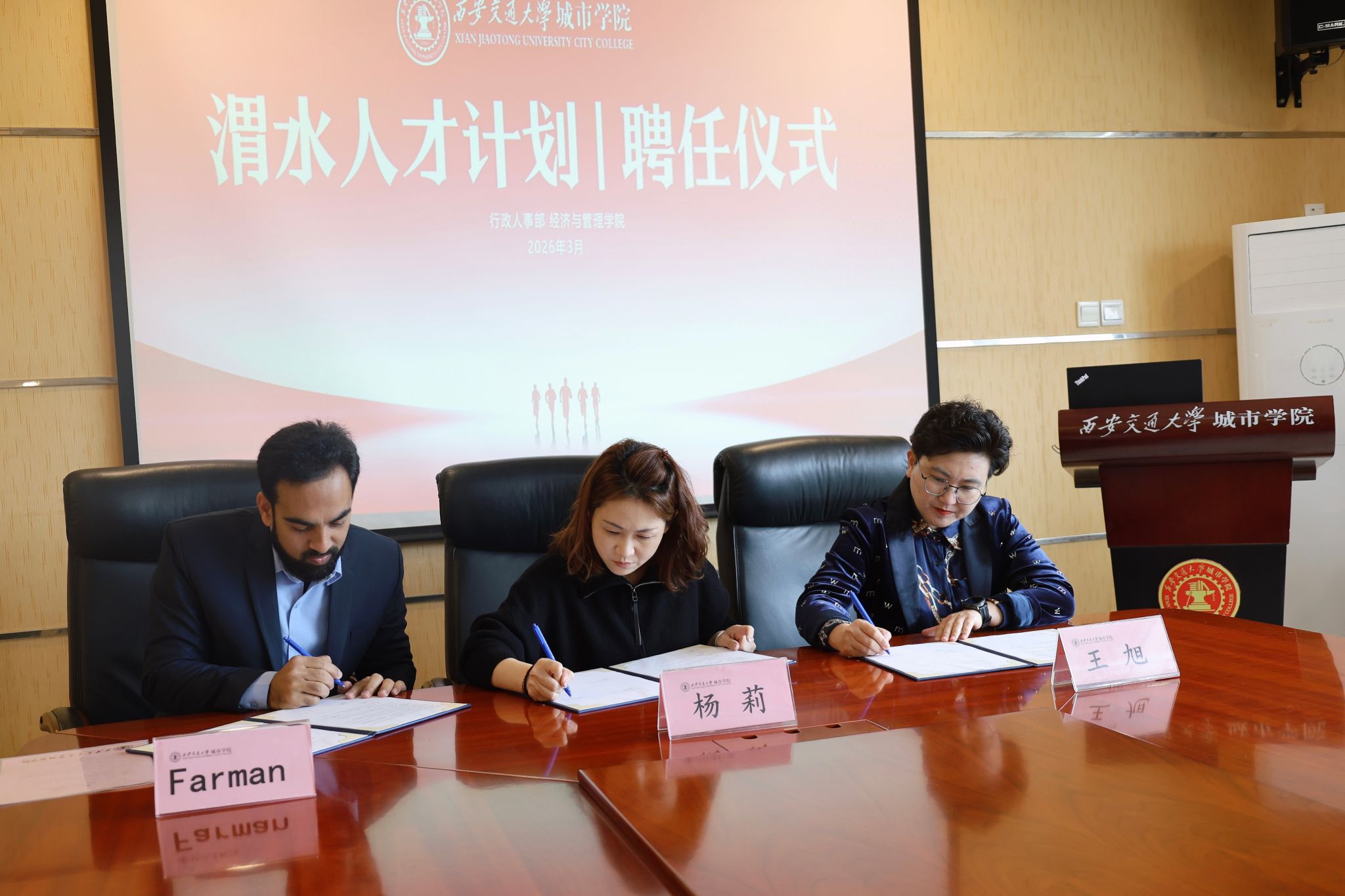 3月16日上午,西安交通大学城市学院举行外籍人才聘任仪式,续聘外籍教师Farman。学院行政人事部副部长杨莉、经济与管理学院副院长王旭、行政人事部部长助理孙晓出席仪式。仪式由行政人事部国际合作交流中心冯欣主持。