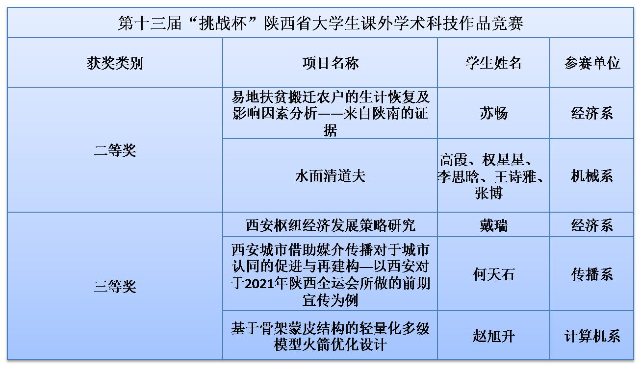 由团省委、省委教育工委、省科协、省社会科学院、省学联共同主办,第十三届“挑战杯”陕汽集团陕西省大学生课外学术科技作品竞赛落幕。我院申报的11件作品中,荣获二等奖2项,三等奖3项,获奖率创新高!团省委书记段小龙、副书记徐永胜、学校部部长郝鹏涛及西安交通大学团委书记苏翔为我院学子的表现点赞。