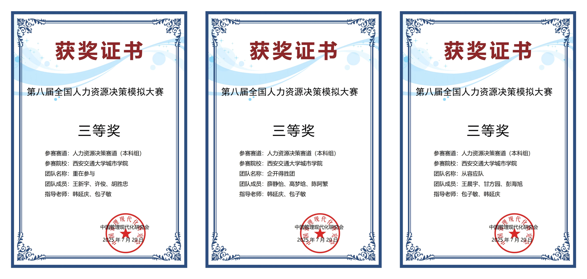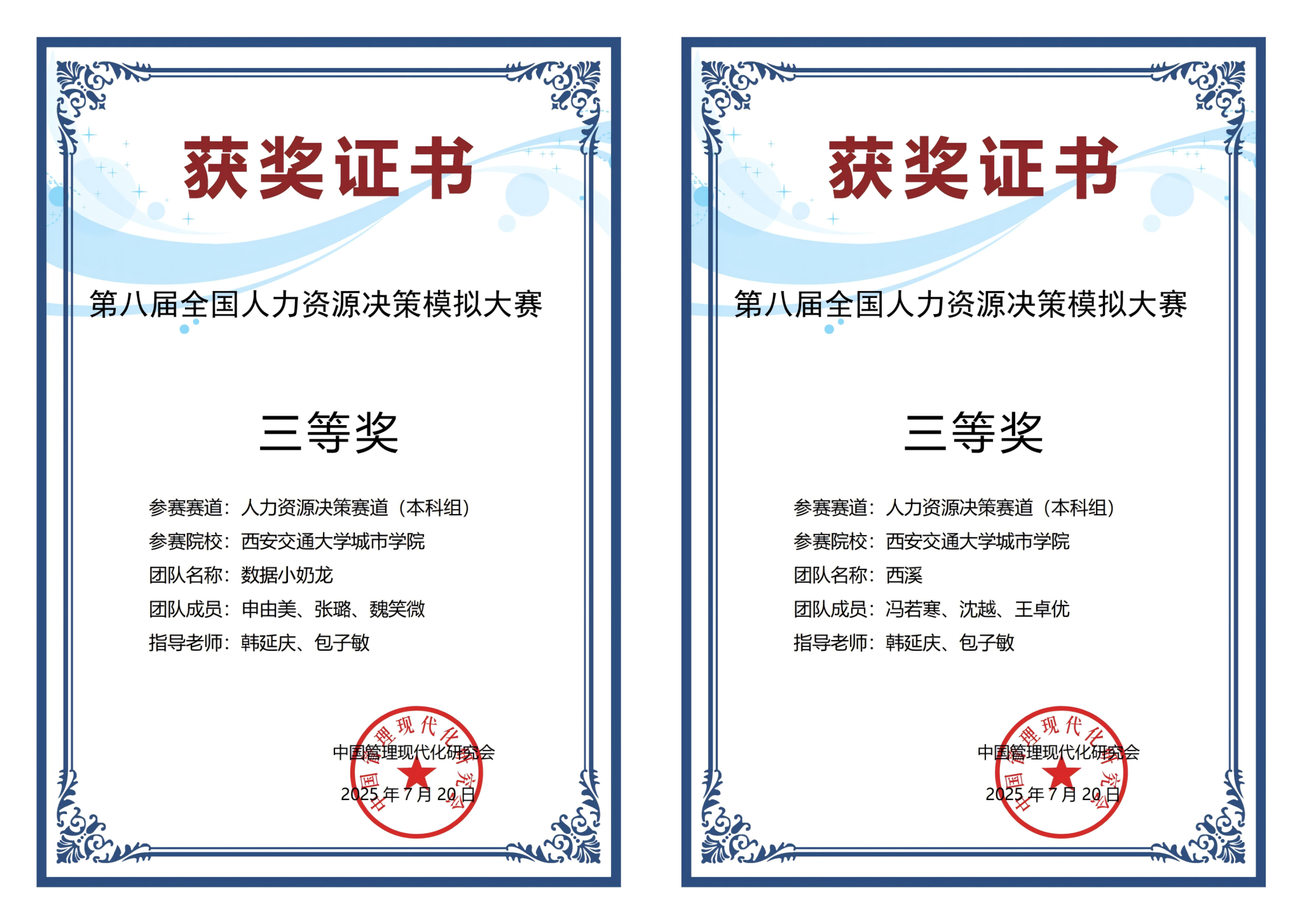 近日,第八届(2025)全国人力资源决策模拟大赛落下帷幕。经过校赛、初赛、复赛等多个环节的激烈比拼,西安交通大学城市学院经济与管理学院代表队斩获国家级二等奖2项、国家级三等奖5项。