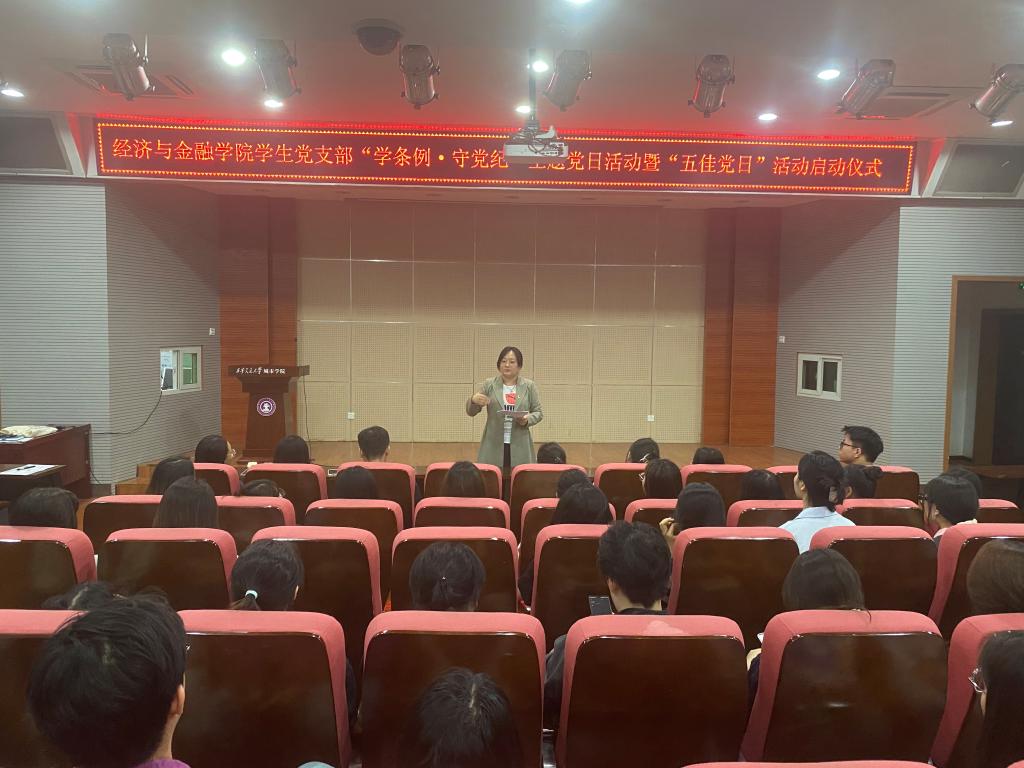 为进一步加强党员的理论素养,提升党员的思想觉悟和工作能力。经济与金融学院学生党支部于4月24日在F100开展“学条例·守党纪”主题党日活动暨“五佳党日”活动启动仪式,本次活动由学生党支部书记廉宇婷主持,参与本次活动的有经济与金融学院学生党支部组织委员杨静怡、宣传委员张进以及支部全体党员。