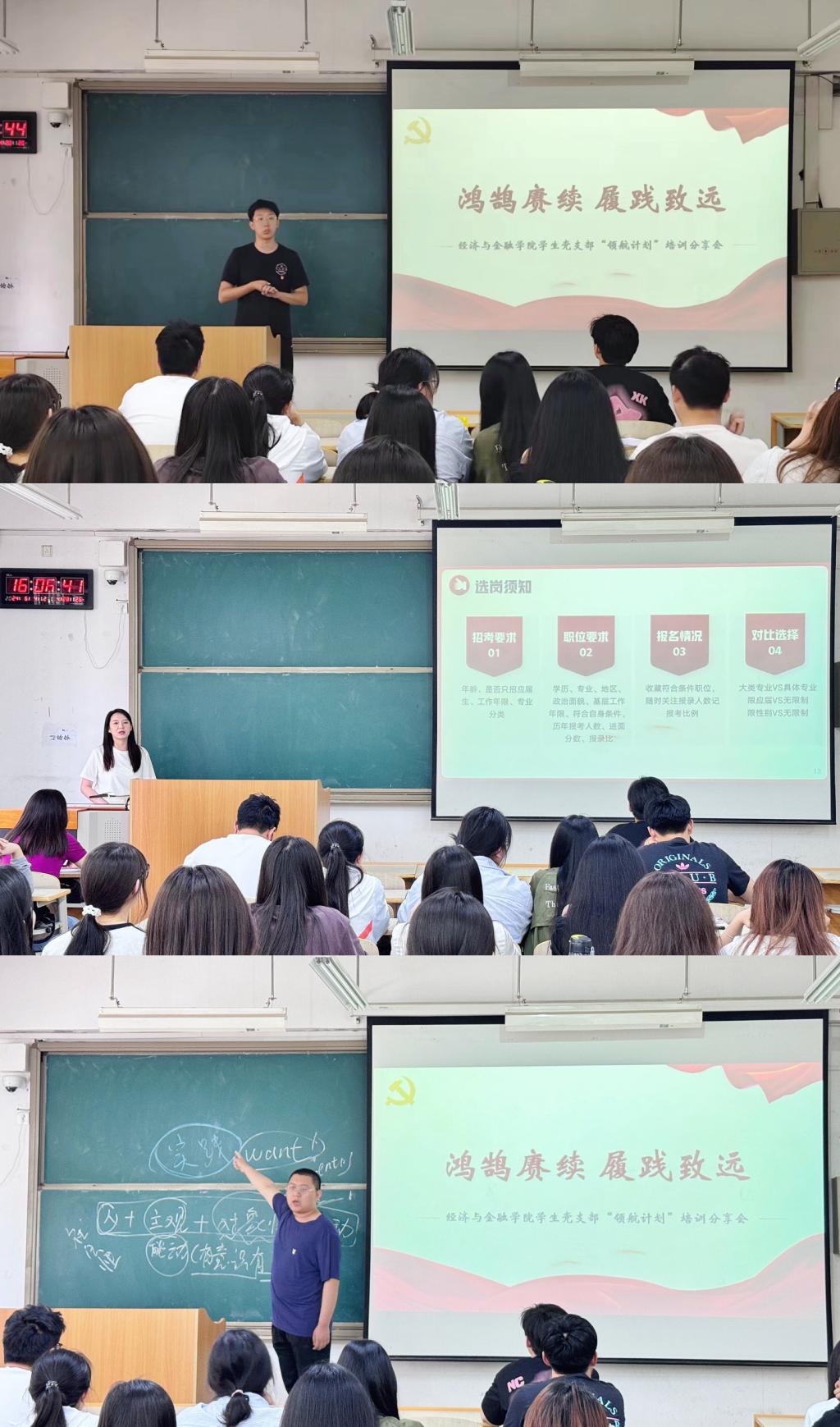随后,学生党员石向前、梁月棋、杜奕博进行经验分享,他们分别以如何在备考中抵抗压力、坚定自己的目标和考公的经验与心得为主题,以实践为切入点鼓励党员们勇于决定,勇于付出,通过提问互动等方式带动党员们积极参与,引领全体党员思考规划未来,拓宽新思路。