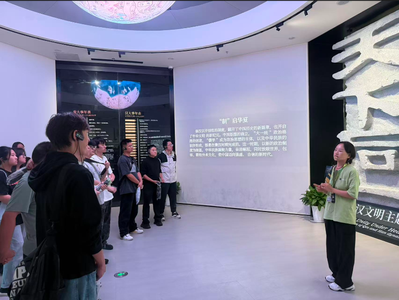随后,研学队伍前往陕西历史博物馆秦汉馆。作为聚焦秦汉文明的专题场馆,这里通过千余件文物与数字展陈技术,系统展现了秦汉王朝从“六王毕,四海一” 到创建多民族大一统国家的历史进程。从象征皇权的青铜礼器,到见证丝绸之路贸易的丝绸残片;从刻有统一度量衡铭文的铜权,到展现科技成就的天文仪器模型,一件件文物串联起秦汉帝国的制度创新与文明高度。在专业讲解员的带领下,同学们依次参观了各个展厅。面对秦兵马俑、杜虎符、鎏金铜蚕等珍贵文物,大家被秦汉时期高超的工艺和深厚的文化底蕴所震撼,不时驻足凝视,仔细聆听文物背后的历史故事。