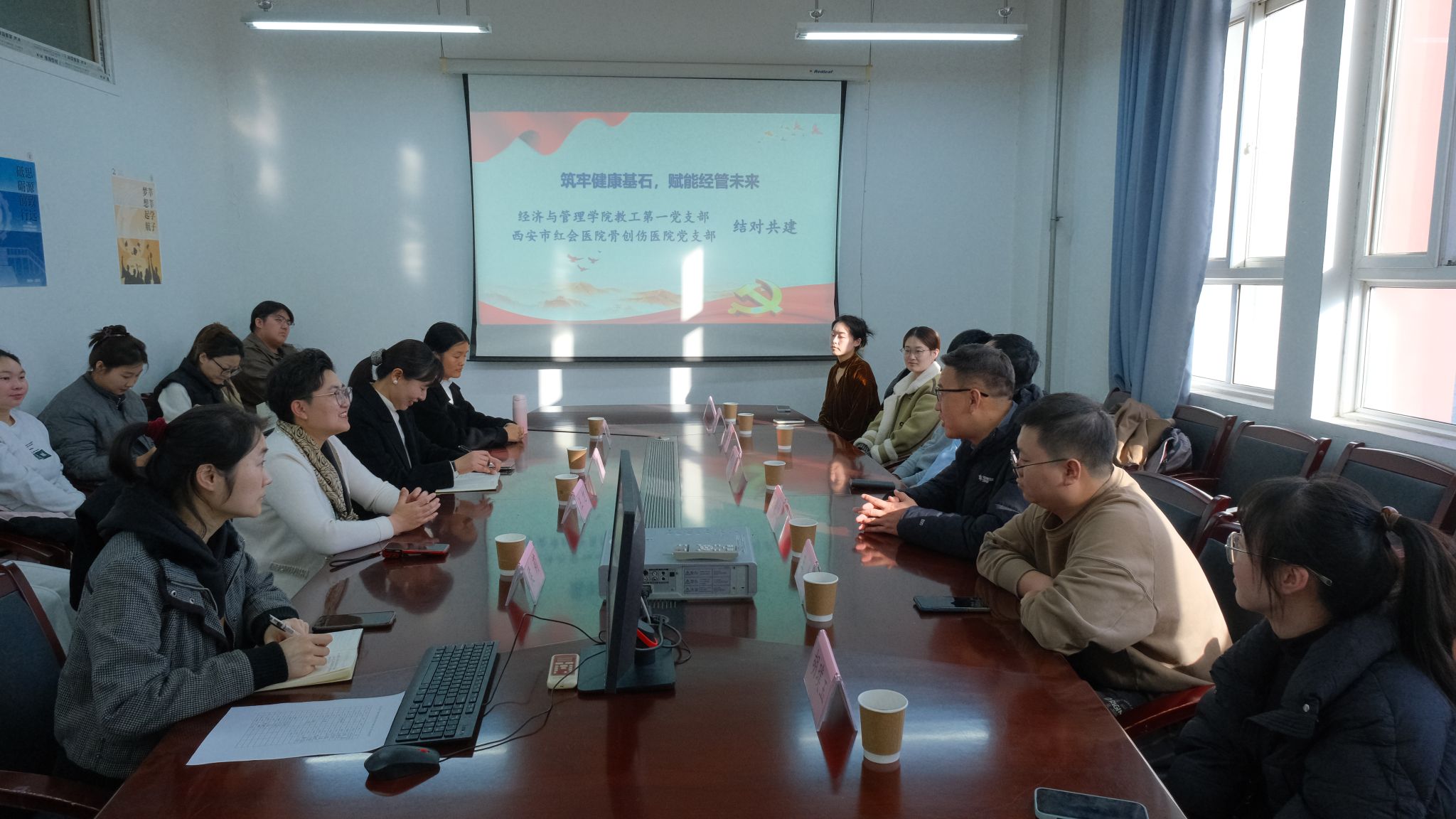 为贯彻落实“健康中国”战略,充分发挥党建引领作用,推动基层党组织合作共建,11月27日下午,经济与管理学院教工第一党支部与西安市红会医院骨创伤医院党支部成功开展结对共建活动。西安市红会医院骨创伤医院王晓龙主任带领医务团队一行七人来校交流,经济与管理学院教工第一党支部全体党员参加活动。活动由党支部书记王旭主持。