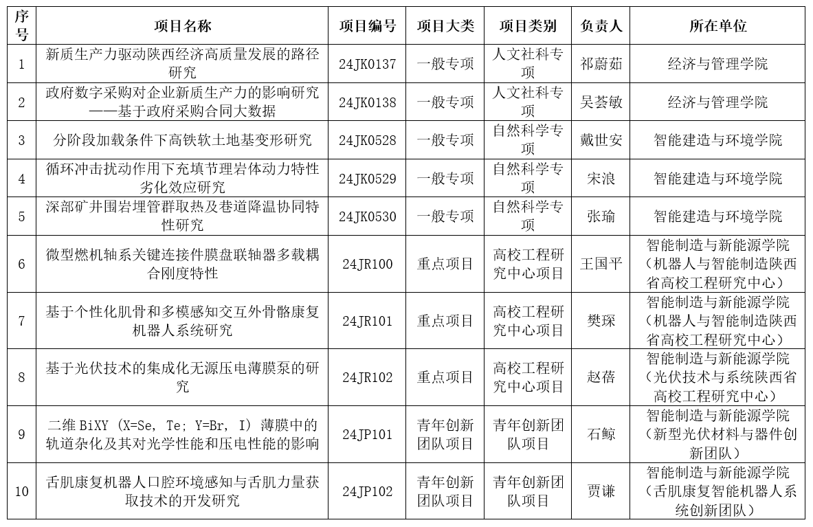 根据《陕西省教育厅科学研究计划项目管理办法》,经学校遴选推荐,陕西省教育厅组织审核、专家评审、厅务会审定和公示,最终确立并下发了2024年度陕西省教育厅科学研究计划项目,我校10项课题获批立项。其中,一般专项5项,重点项目(高校工程研究中心项目)3项,青年创新团队项目2项。